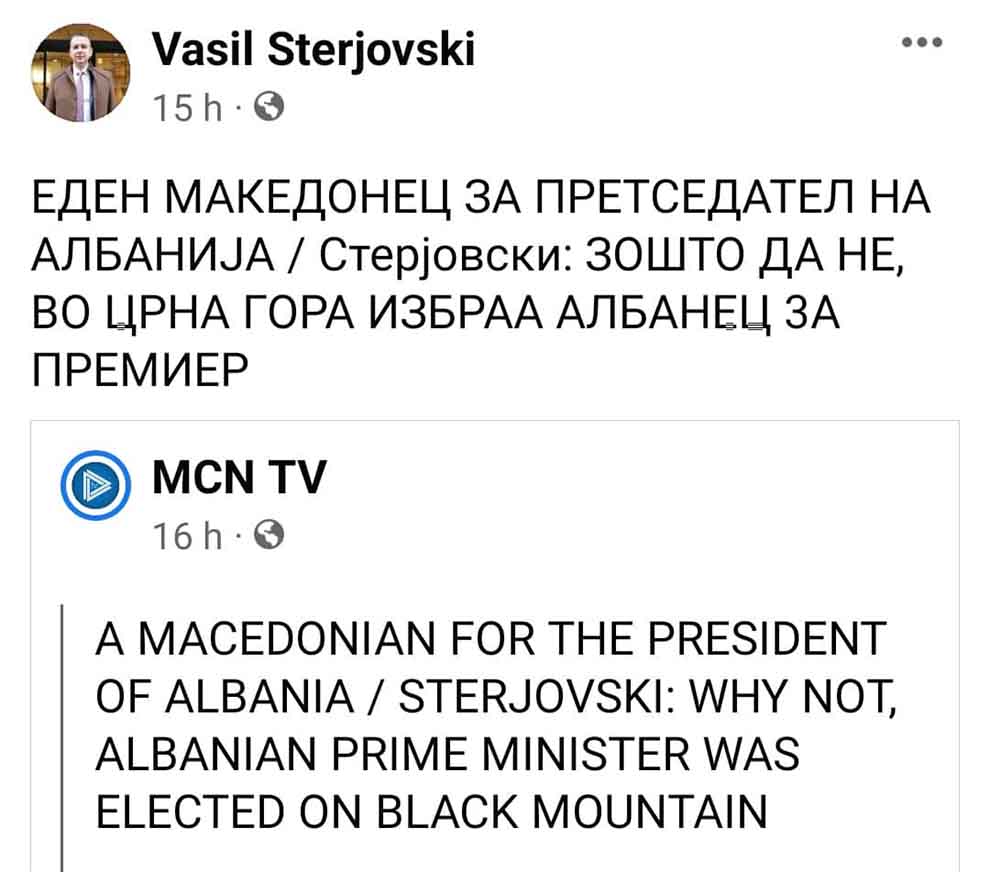 лидер на единствената македонска партија во Албанија – Македонска алијанса за европска интеграција – МАЕИ во изјава за албанската национална телевизија МЦН