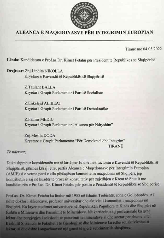 „Зошто да не. Неодамна го имавме случајот со изборот на премиерот на Црна Гора, црногорски државјанин со албанско потекло кој се бори за својата земја, за демократијата во Црна Гора. Зошто да не се гласа од пратениците на Парламентот на Албанија еден ваков кандидат, проф. д-р Кимет Фетаху“